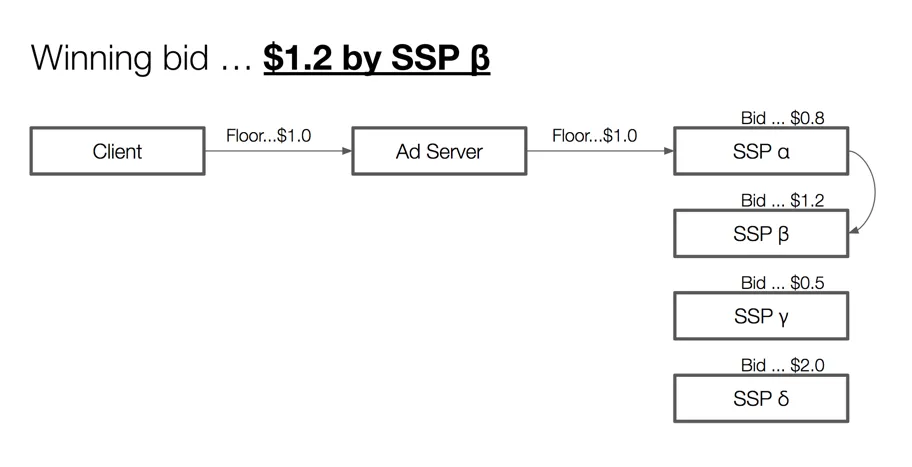 | 3 | Bid Server -> Client | Return the bidding results. Here, since "SSP δ" returned a response to purchase for $2.0, the Winning bid becomes $2.0 |
